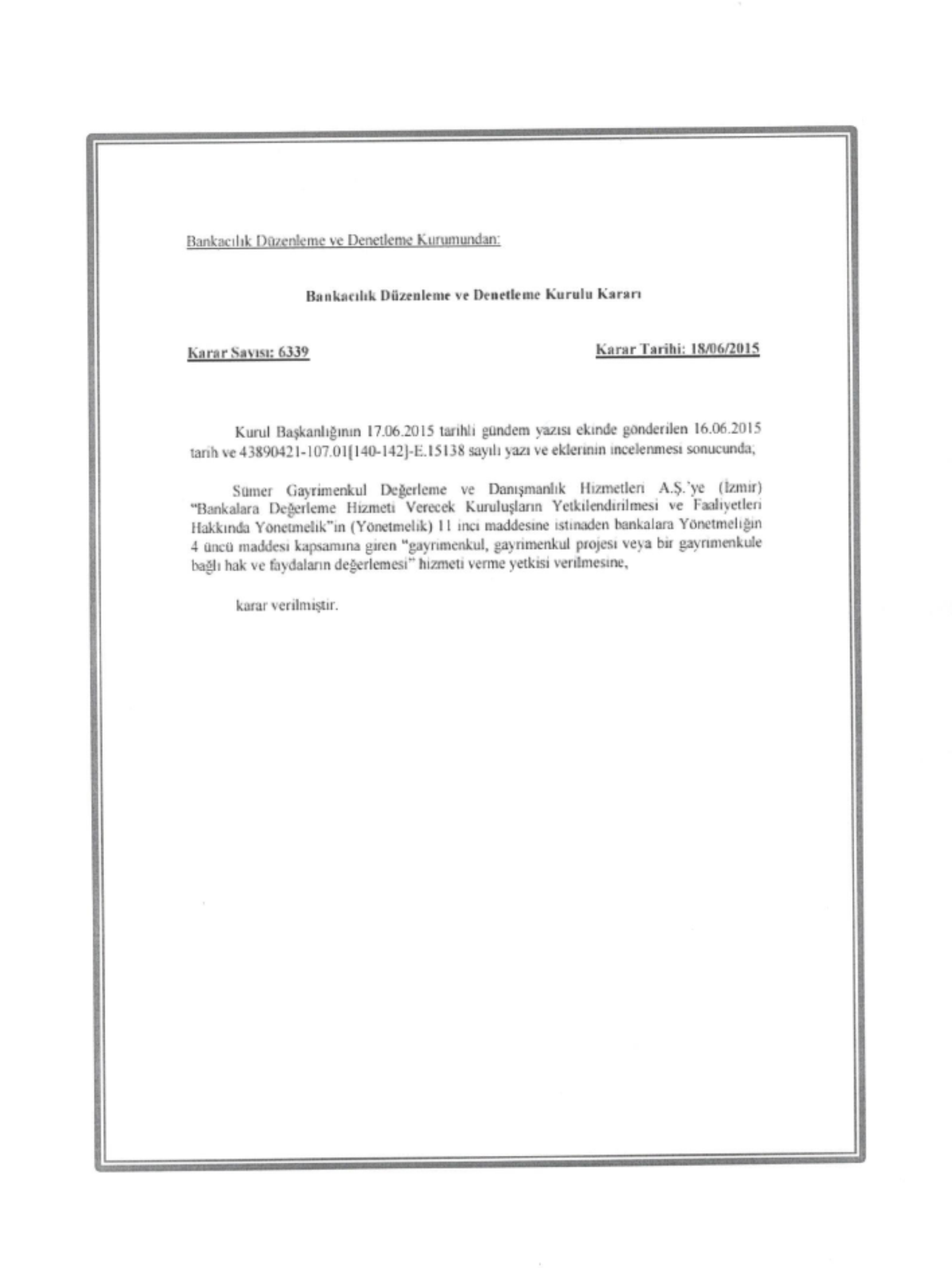 Bankacılık Düzenleme ve Denetleme Kurumu tarafından 18.06.2015 tarihinde “Bankalara Değerleme Hizmeti Verecek Kuruluşların Yetkilendirilmesi Ve Faaliyetleri Hakkında Yönetmelik” kapsamında hizmet verme yetkisi verilmiştir.