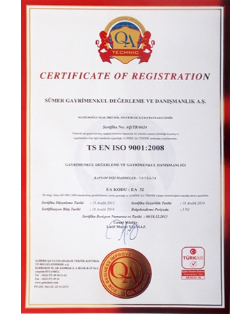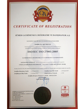 Sümer Değerleme ve Danışmanlık A.Ş. 18 Aralık 2015 tarihinde TS EN ISO 9001:2008 belgesini almıştır.