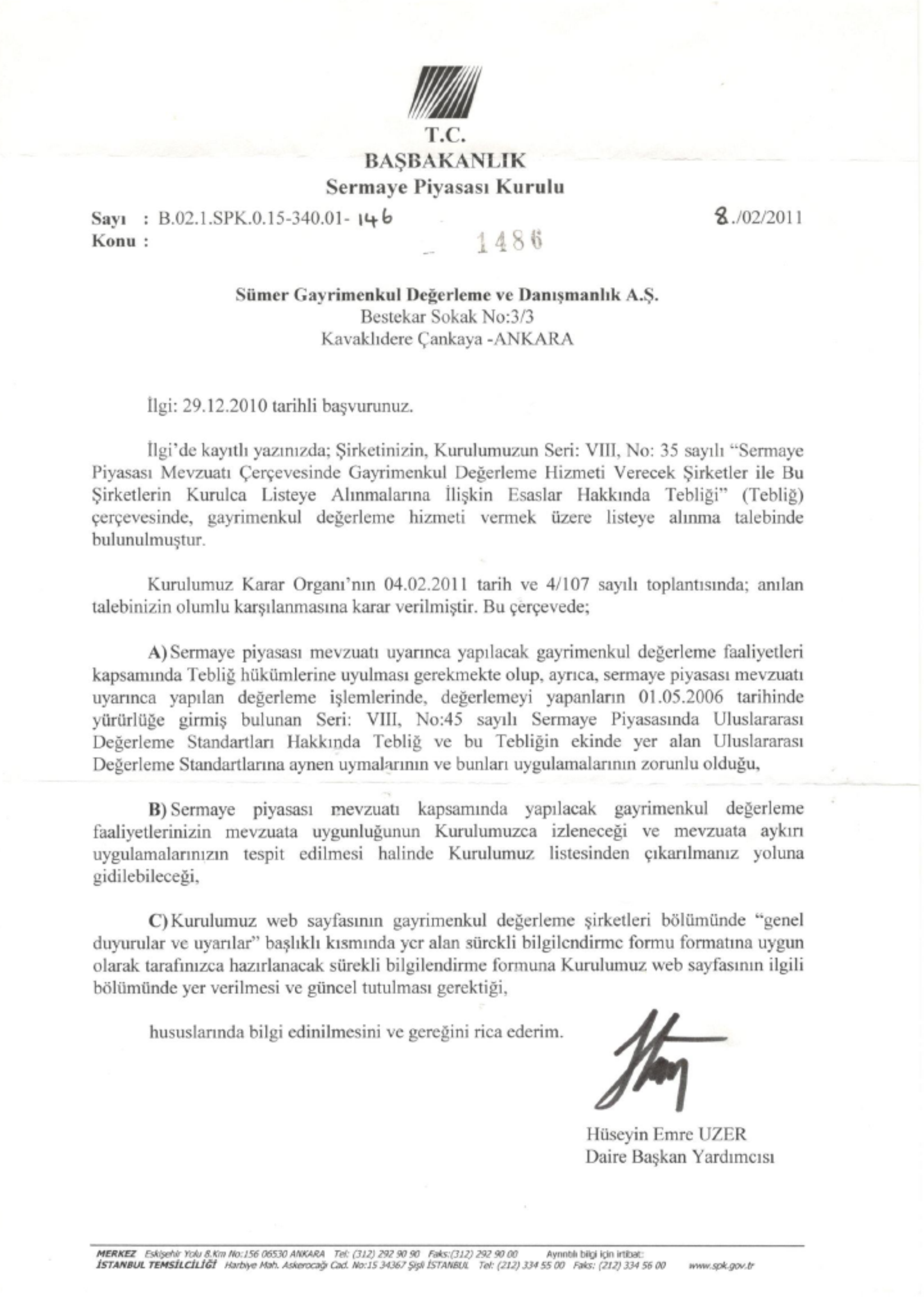 Sümer Gayrimenkul Değerleme ve Danışmanlık A.Ş. Sermaye Piyasası Kurulu’nca “Seri: VIII, No: 35 Sayılı Sermaye Piyasası Mevzuatı Çerçevesinde Gayrimenkul Değerleme Hizmeti Verecek Şirketler ile Bu Şirketlerin Listeye Alınmalarına İlişkin Esaslar Hakkında Tebliğ” kapsamında 08.02.2011 tarihinde listeye alınmıştır.